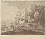 Wooded Landscape with Herdsman Driving Cattle over a Bridge, with Rustic Lovers and Ruined Castle