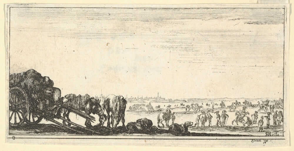 Plate 8: a chariot and two horses to left, a dog in center, various horses and soldiers in the background, from 'Troops, cannons, and attacks on towns' (Dessins de quelques conduites de troupes, canons, et ataques de villes)