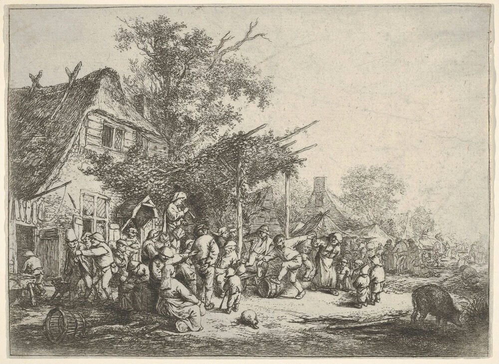 A group of figures dancing under a trellis attached to a house, a standing figure carrying a drum and holding a horn to his mouth, surrounded by onlookers, a lane with houses and carriages beyond