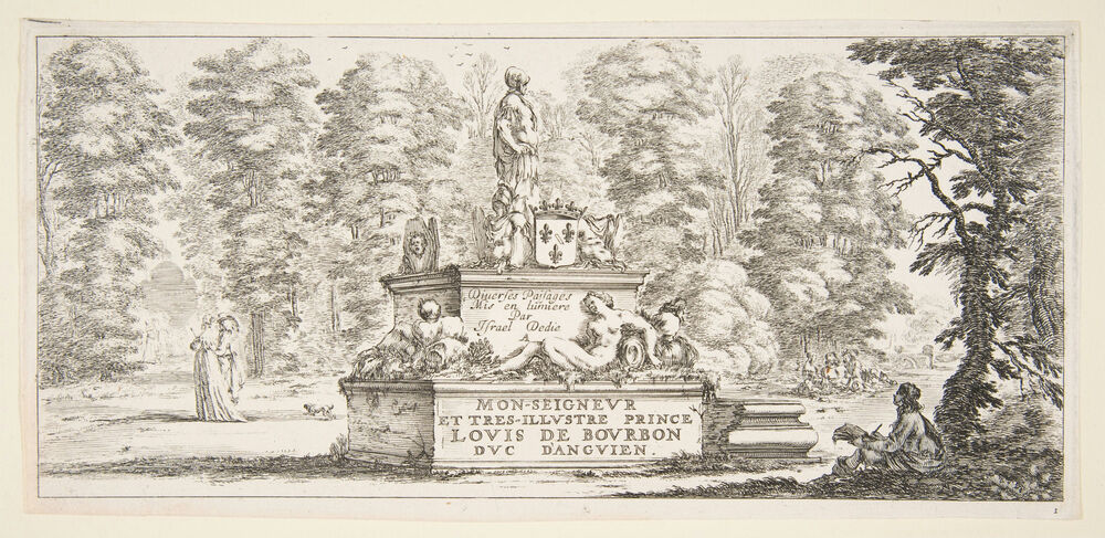 Plate 1: a monument with statues and a coat of arms in the center, a draughstman on the ground beneath a tree to right, two groups of lovers to left in the background, from 'Various landscapes' (Divers paysages)