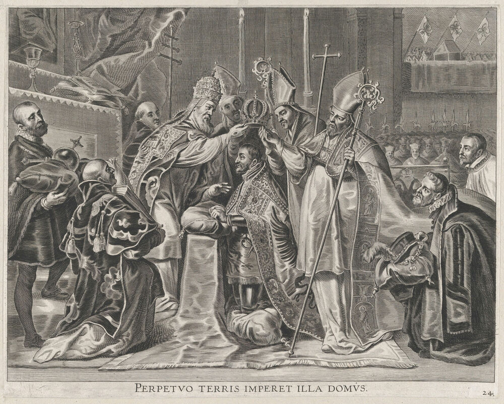 Plate 24: Charles V crowned Emperor by the Pope; from Guillielmus Becanus's 'Serenissimi Principis Ferdinandi, Hispaniarum Infantis...'