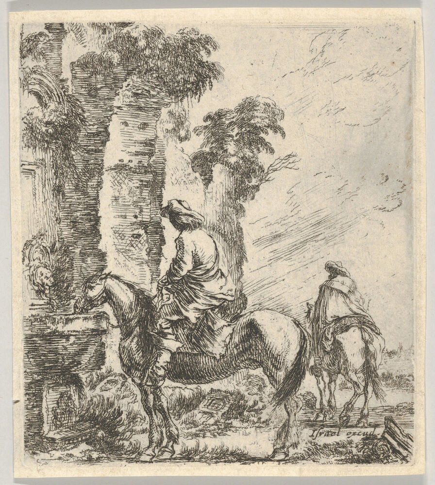 Plate 19: a rider making his horse drink from a basin of a fountain at left, another horseman seen from behind riding towards the left in the background, from 'Various figures and doodles' (Diverses figures et griffonnemens)