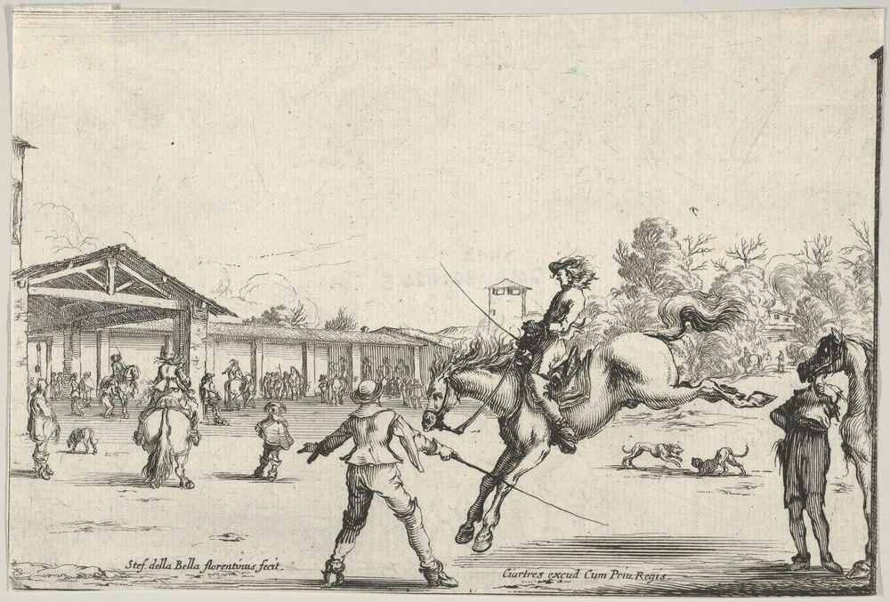 A riding school, a horseman with sword jumping directed by another man with a sword in center, a man standing next to his horse to right, various horsemen, the school, and two dogs in the background, from 'Varie figure'