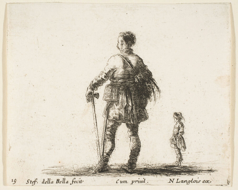 Plate 19: a Polish nobleman in court dress, standing in center, seen from behind, another nobleman to right in background, from 'Diversi capricci'