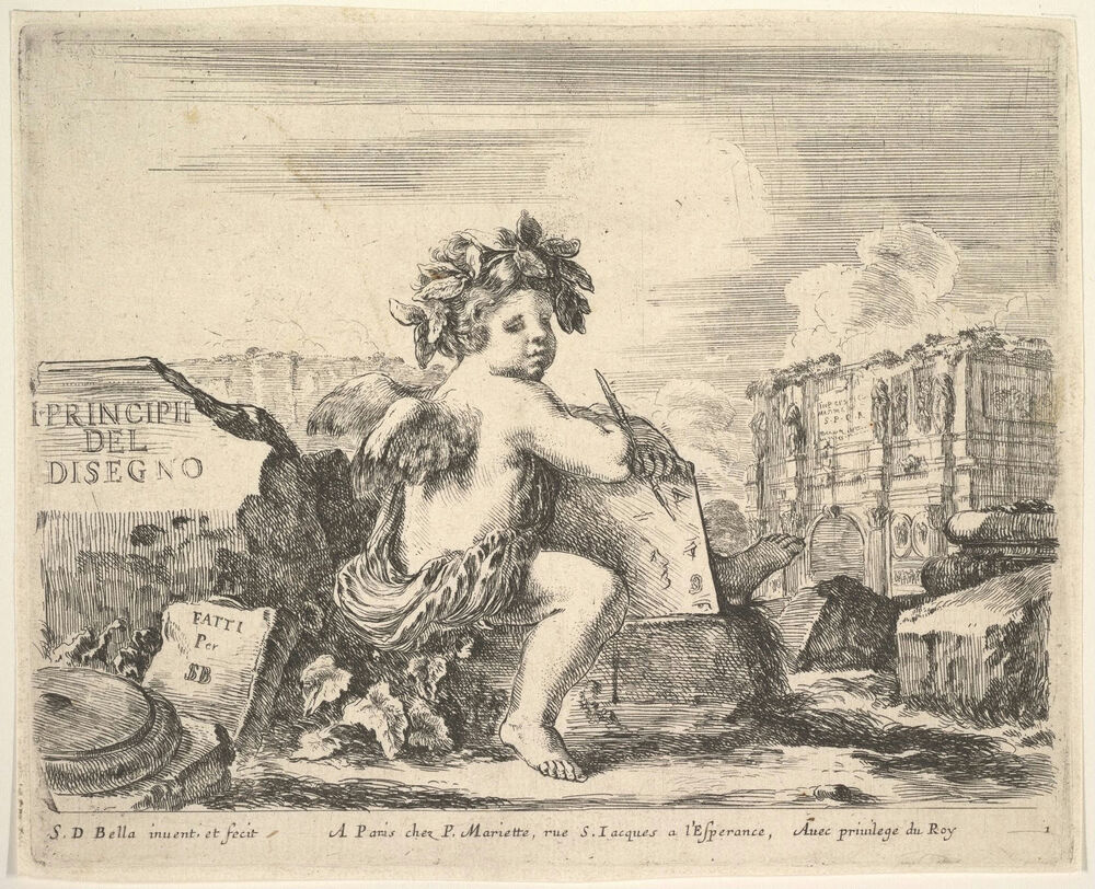 Plate 1: the genius of drawing, a child with wings, seated on a rock in center turned towards the right, holding a drawing pad and pen, ruins including a triumphal arch to right in the background, the title page from The Principles of Design (I principii del disegno)