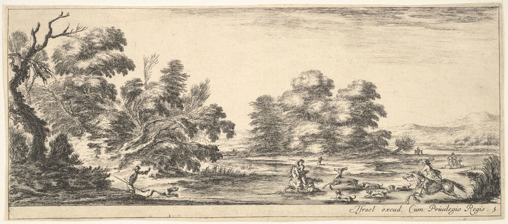 Plate 5: two horsemen in a stream to right, riding towards the left, following four dogs chasing a stag, another dog running into the water from the left, from 'Various landscapes' (Divers paysages)