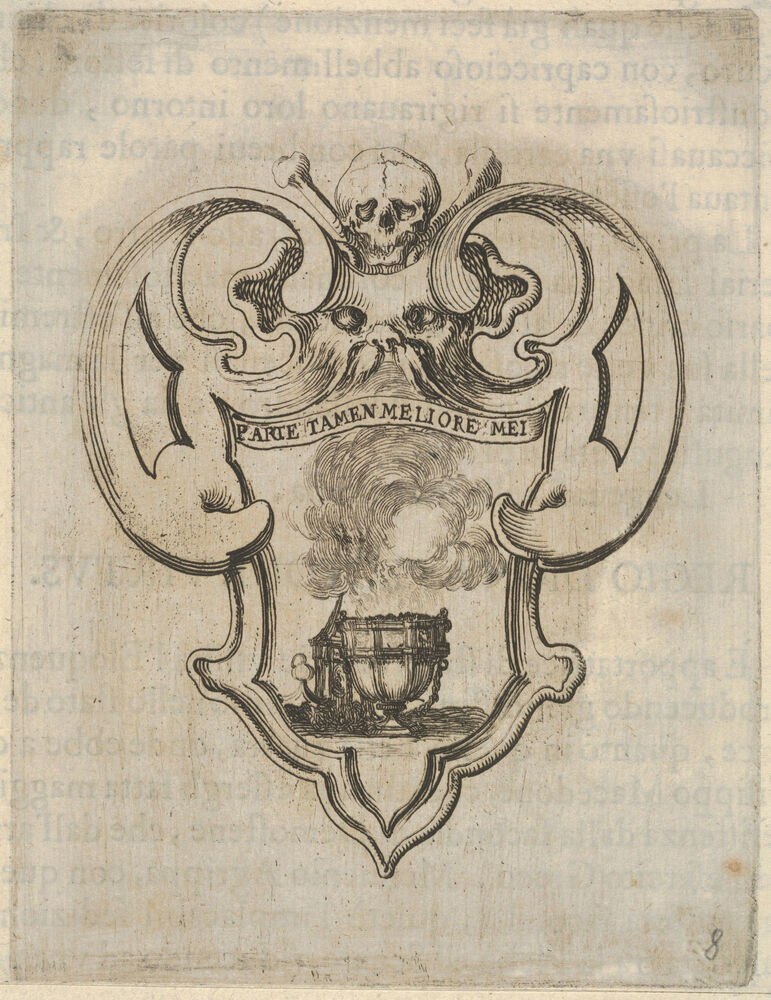 A cartouche with a censer, a skull and crossbones and a grotesque face at top, from 'Eight Emblems for the Funeral of Francesco de Medici' (Huit emblèmes pour les funérailles du prince François de Médicis)