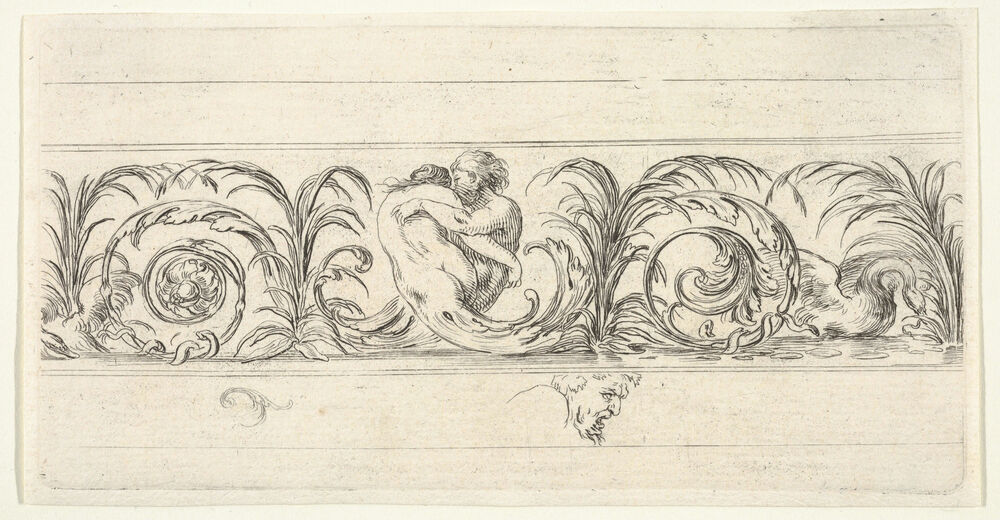Plate 6: a triton and a siren fighting at center, their legs as scrollwork, a swan to right, the grotesque head of an old man below, from 'Friezes, foliage, and grotesques' (Frises, feuillages et grotesques)