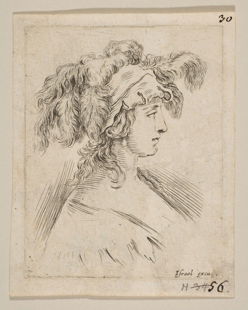 Plate 15: mid-bust of a young woman in profile wearing a hat topped with feathers, from 'The Book for Learning to Draw' (Livre pour apprendre à dessiner)
