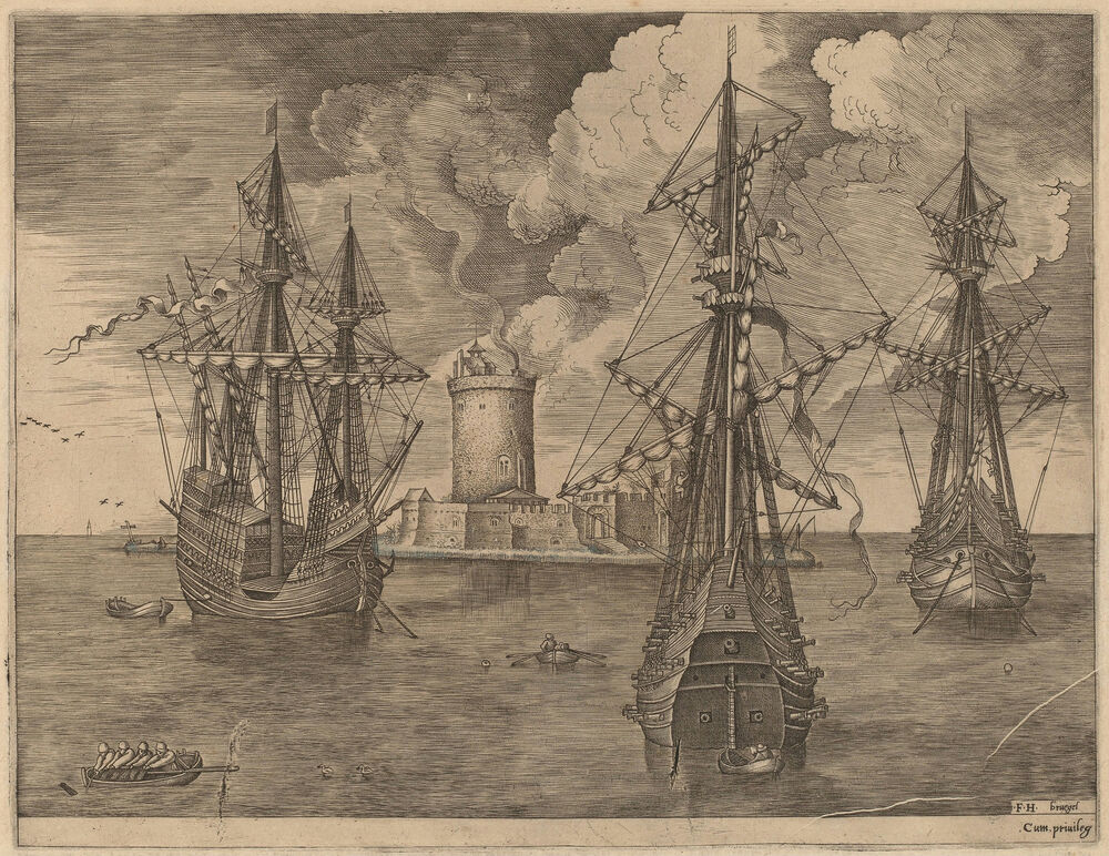 Four-Master (Left) and Two Three-Masters Ancored Near a Fortified Island with a Lighthouse