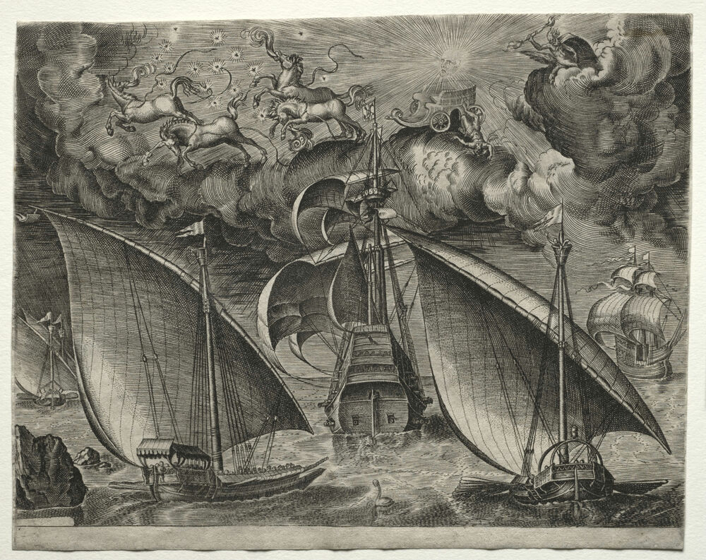 Sailing Vessels: Two Galleys Sailing Behind an Armed Three-Master with Phaeton and Jupiter in the Sky