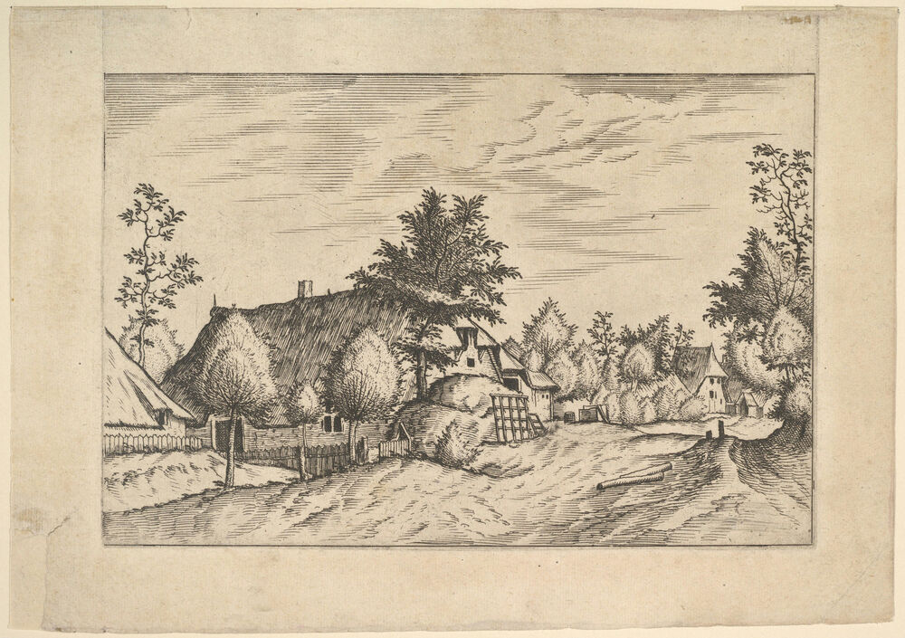 Village Street, hay stacked in front of a farm from Praediorum villarum et rusticarum casularum icones elenoantissimae ad vivum in apre deformatae