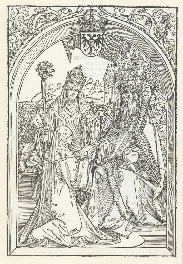 Roswitha van Gandersheim biedt keizer Otto I een exemplaar van haar boek aan