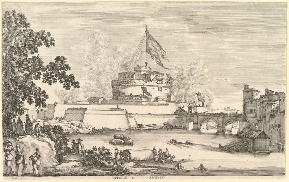 View of the Tiber river, a large tree to left, two groups of women to left in the foreground, a bridge leading to the Castello Sant'Angelo to left, above which a large flag is hoisted, clouds of gunsmoke to right and left of the castle