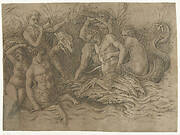 Maria met kind omgeven door engelen in grot met Jozef en koning in aanbidding