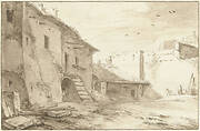 Man Adjusting His Footwear, at Left Three Men Playing Cards