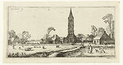 Hoge vierkante toren achter een muur gelegen aan een gracht
