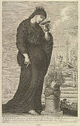 Rhetoric: a young woman standing in a decorated interior with a caduceus in her right hand and a closed fan in her left hand, from the series 'The liberal arts' (Les arts liberaux)